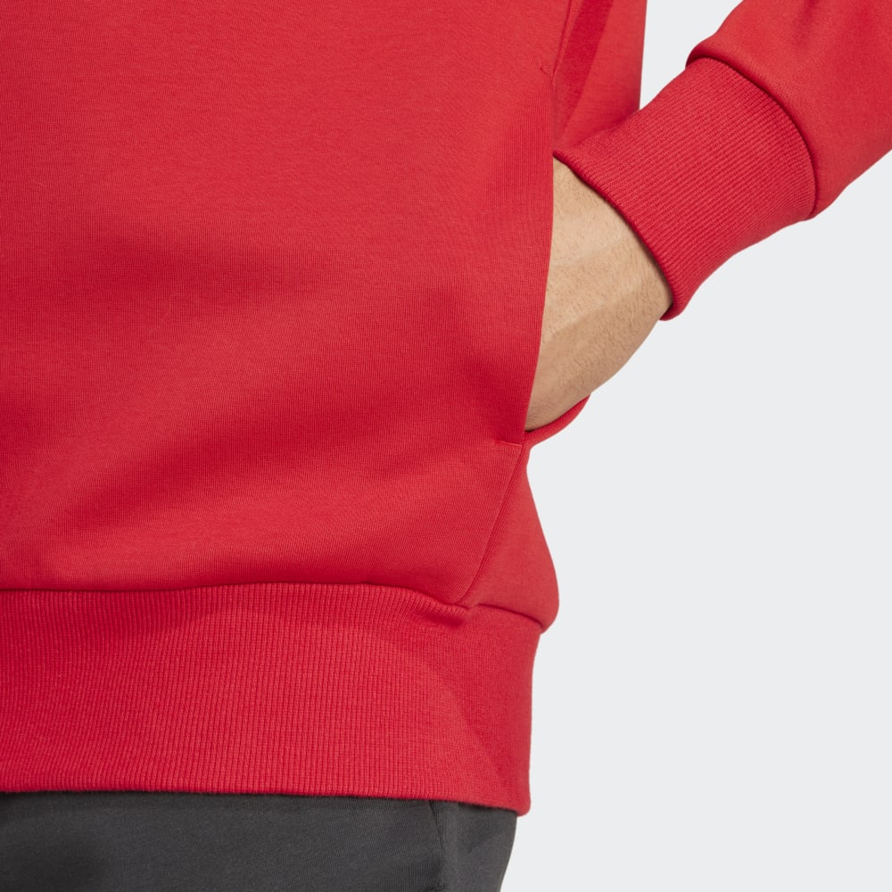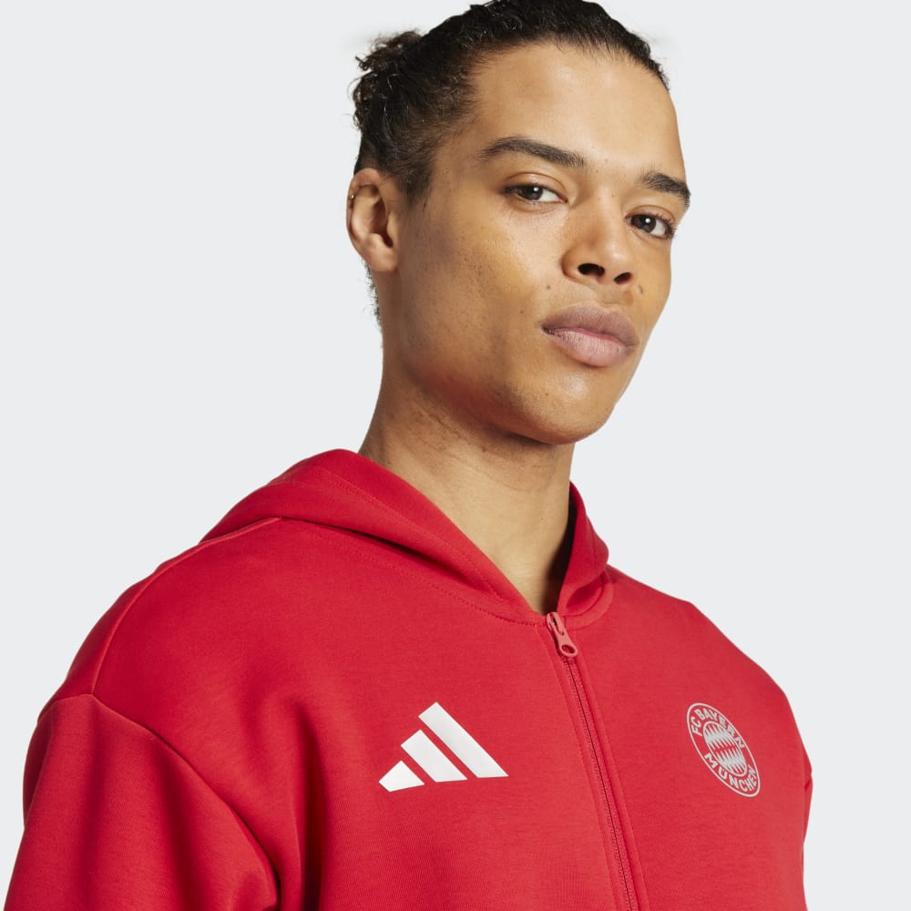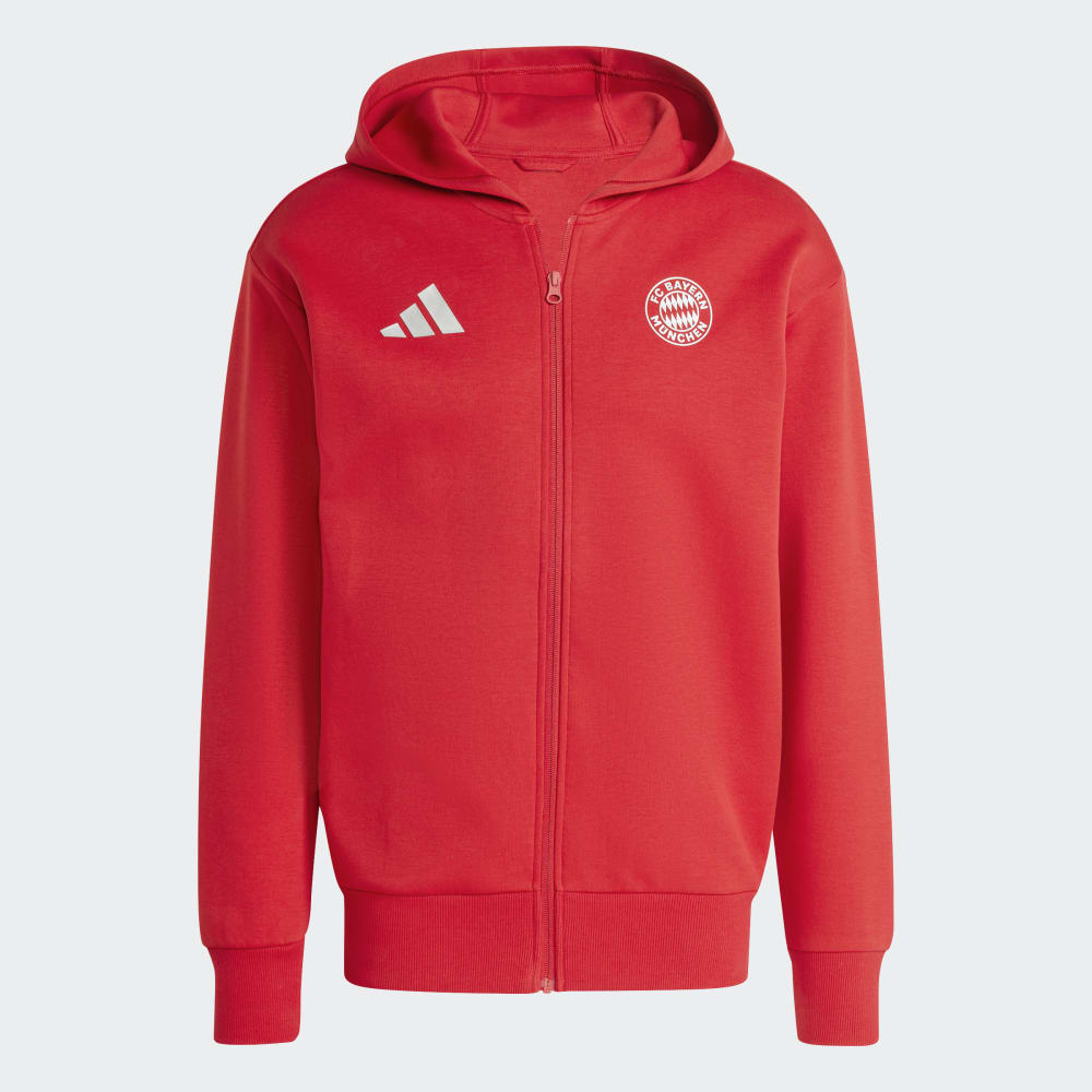 Mit dieser adidas Fußballjacke zeigen sich die Profis des FC Bayern München vor dem Anpfiff als Einheit. Sie kommt in der berühmten roten Vereinsfarbe und sorgt mit der großen Kapuze und dem weichen Doppelstrick für ein bequemes Tragegefühl. Das aufgedruckte Vereinslogo auf der Brust macht zudem auf den ersten Blick klar, für welchen Club dein Herz schlägt.